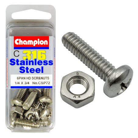 View full detailsCHAMPION MACHINE SCREW NUT PAN PHILLIPS STAINLESS STEEL 316INX1 14IN 316A4