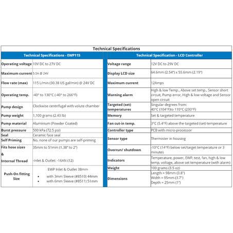 | Features | • The Davies, Craig 8951 EWP115 Alloy 24V Kit includes the following components: • EWP115 Alloy x1 • EWP & Fan LCD Controller x1 • Inline Adaptor x1 • Wiring Harness (10A Fuse) x1 • Thin Rubber Sleeves x4 • Hose Clamps x4 • EWP Hardware Bag x1 • The EWP115 Alloy 24V is available for purchase in the following options: • Pump Only (Part # 8141) • Kit (Part # 8041) • Combo with Controller (Part # 8951) |