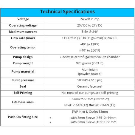| Features | • The EWP115 Electric Water Pump - universal fit, do-it-yourself, easy to install water pump designed to replace or compliment your existing belt-driven mechanical water pump. • The EWP115 Alloy 24V is available for purchase in the following options: • Pump only (Part # 8141) • Kit (Part # 8041) • Combo with Controller (Part # 8951) |