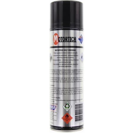 | Features | • Motortech Belt Dressing is formulated to help silence squeaks • Conditions all types of flat and V belts • Additives extend belt life and reduce drying and cracking • Recommended for use on all types of motor driven belts • 100% Australian Made and Owned |
